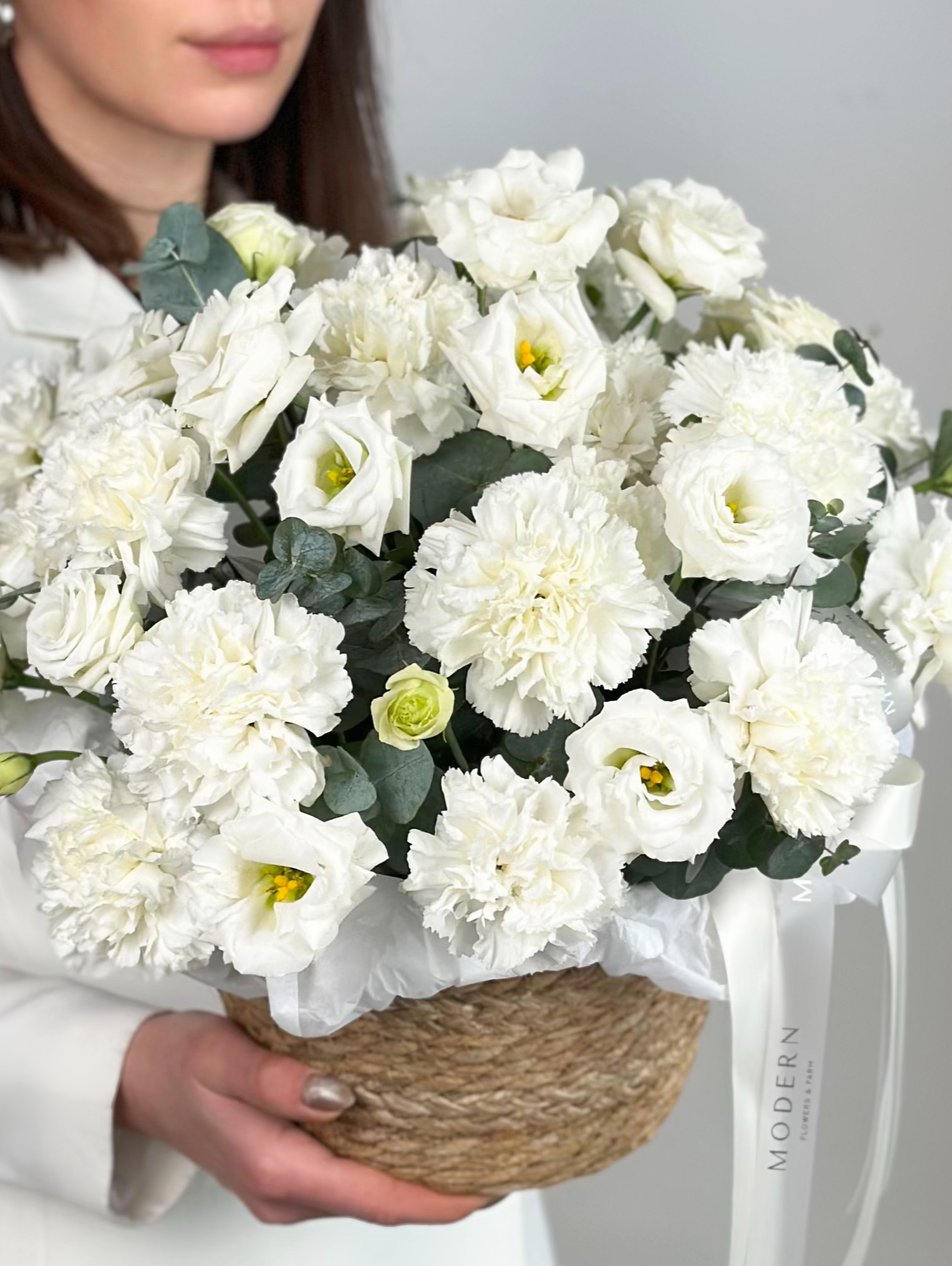 БЕЛОСНЕЖНАЯ КОРЗИНА С ЭУСТОМОЙ И ГВОЗДИКОЙ