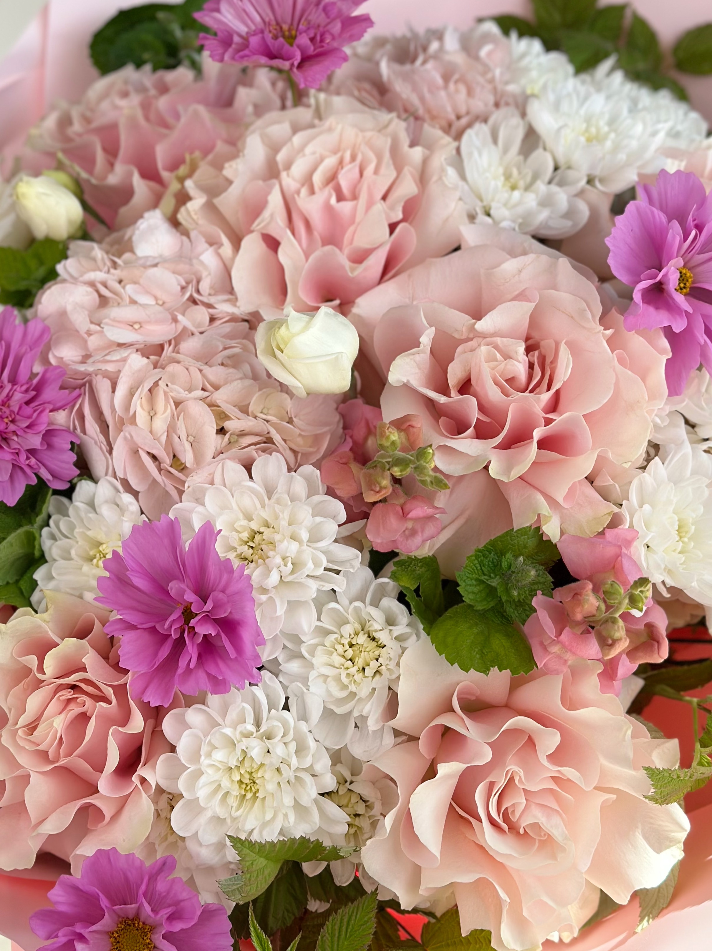 Представляем вашему вниманию изысканную цветочную композицию, где благородство французской розы переплетается с утонченностью гортензии и элегантностью хризантемы.