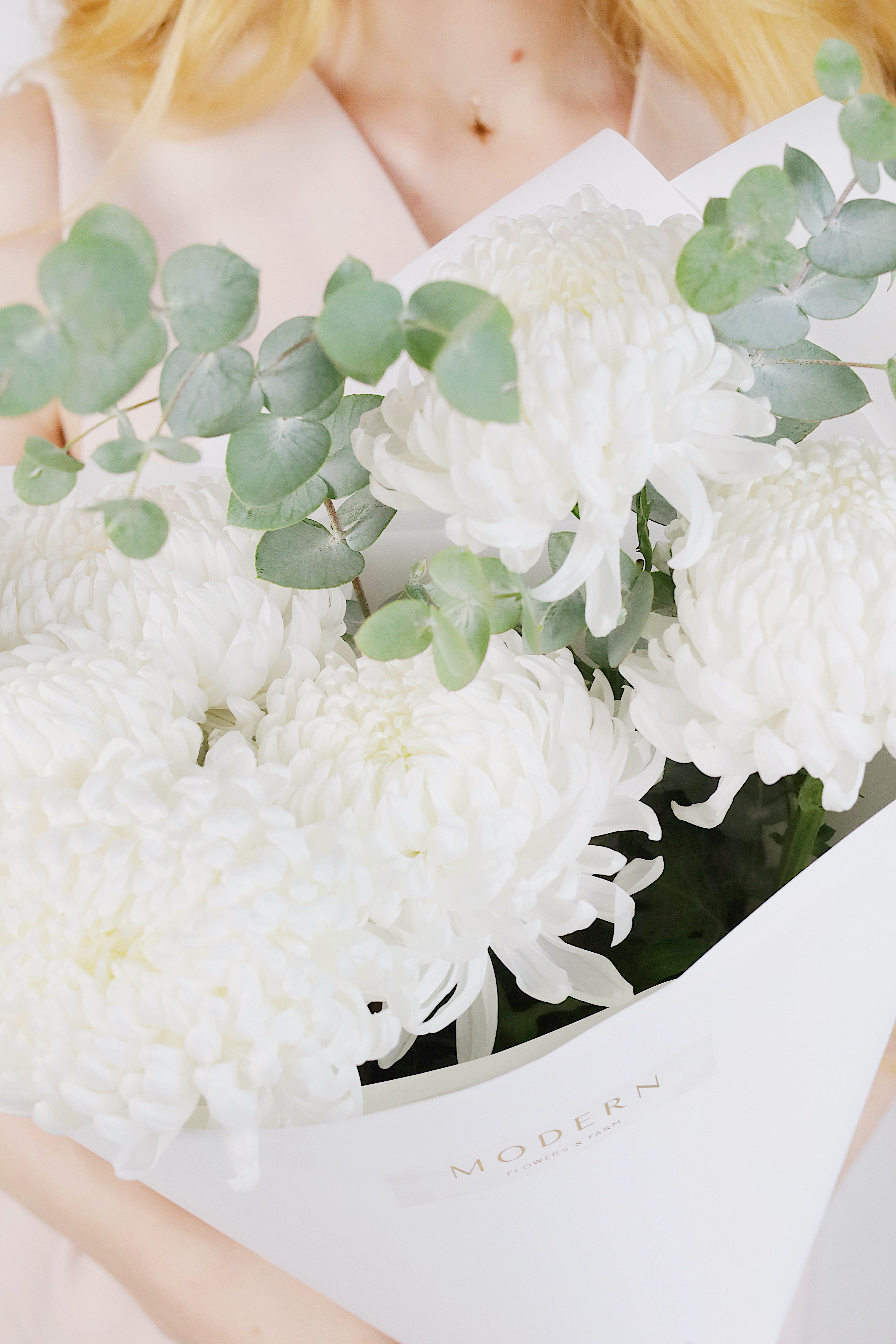 БУКЕТ С БЕЛОЙ ХРИЗАНТЕМОЙ И ЭВКАЛИПТОМ