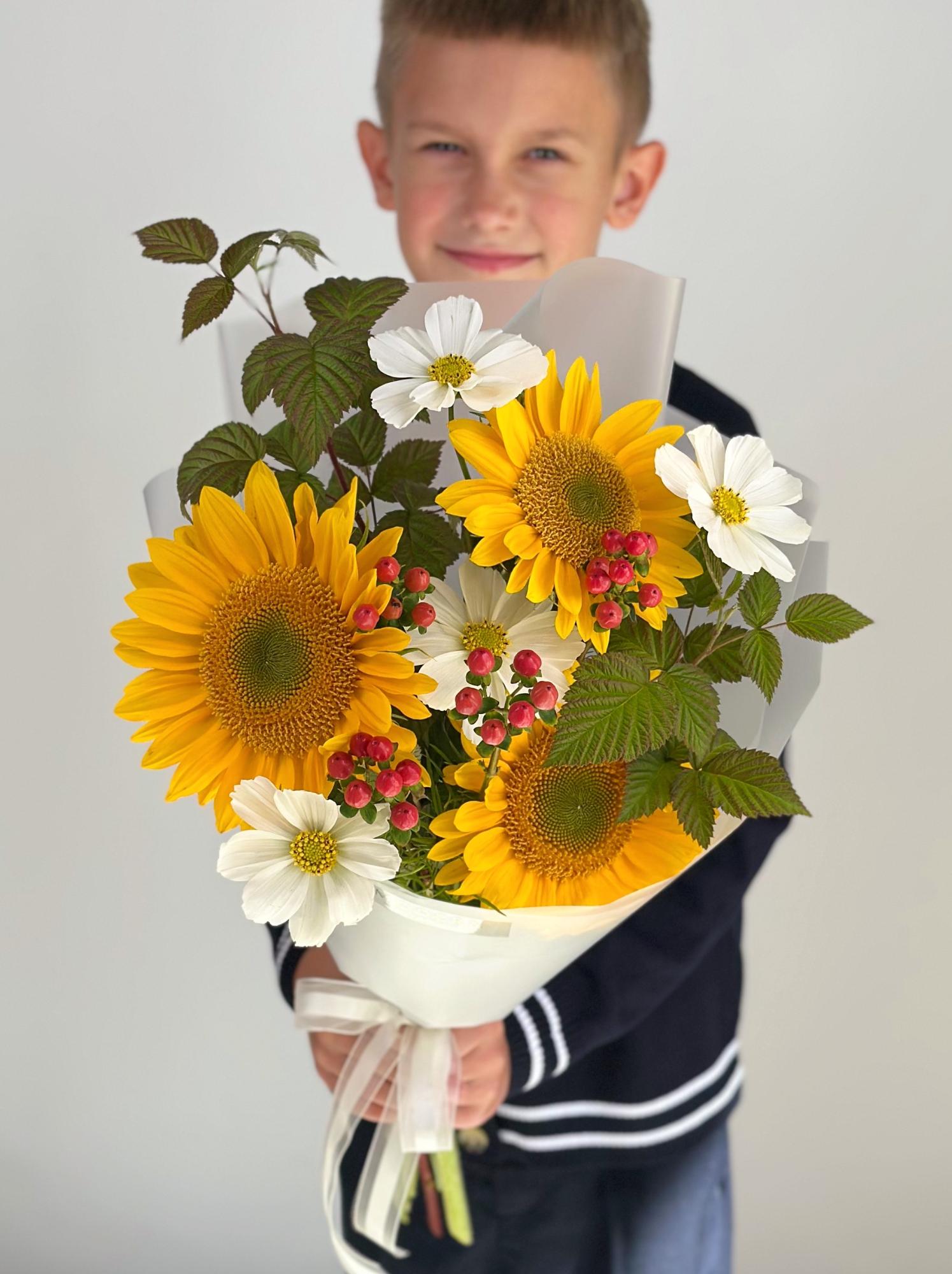 БУКЕТ С ПОДСОЛНУХАМИ И КОСМЕЕЙ