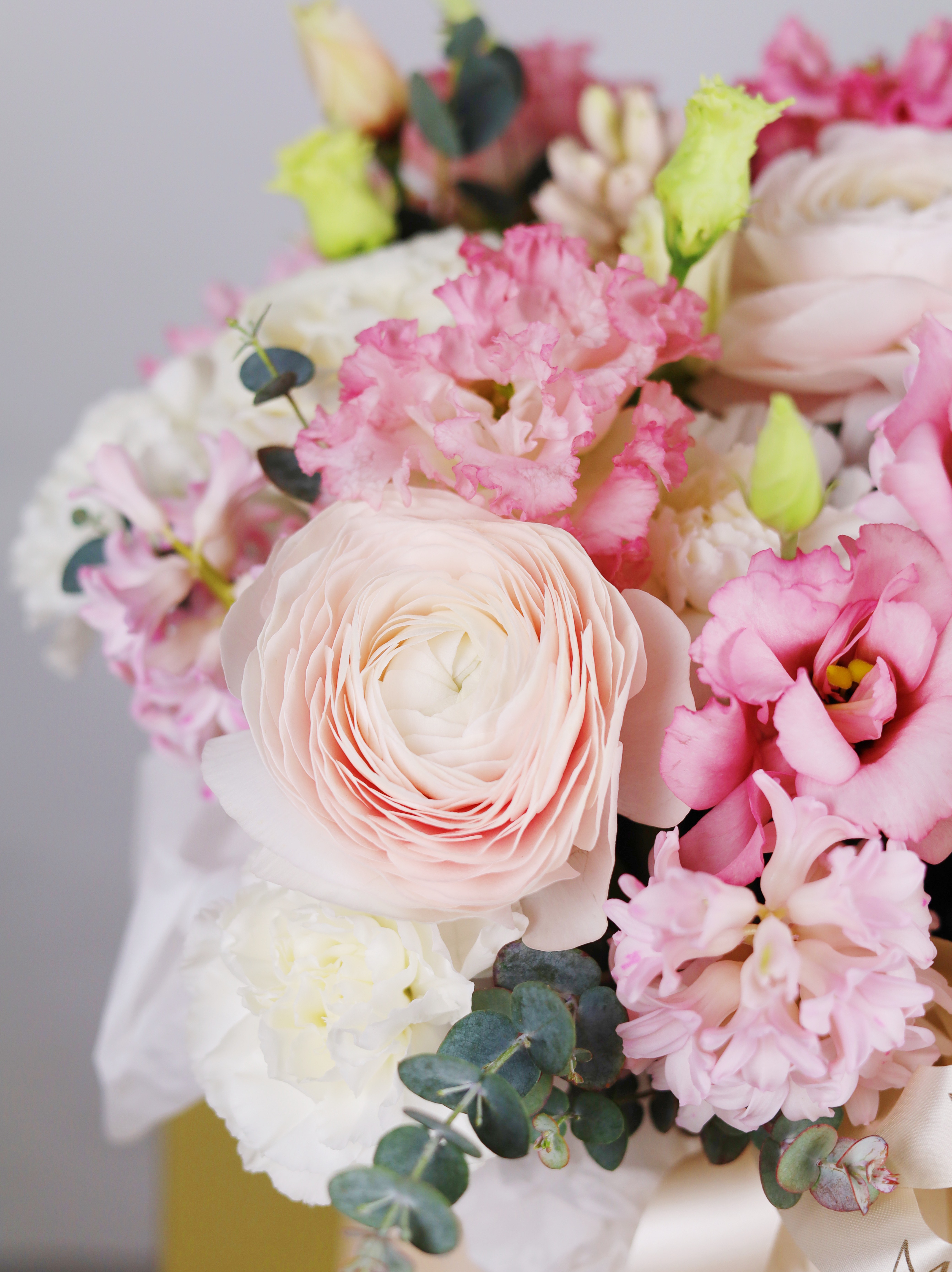 БУКЕТ С РАНУНКУЛЮСАМИ, ГИАЦИНТОМ И ЛИЗИАНТУСОМ В БАРХАТНОЙ КОРОБКЕ