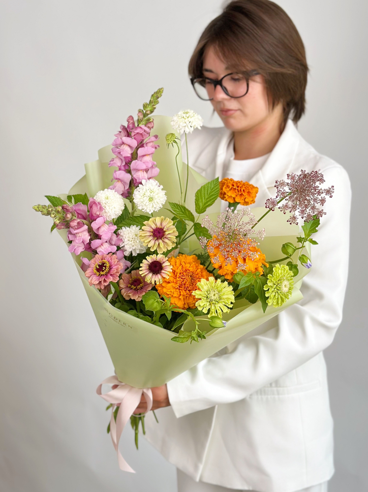 Предлагаем охапки в крафте с цветами, выращенными на нашей ферме — дельфиниум, львиный зев, ромашки, маттиола, астра и другие.