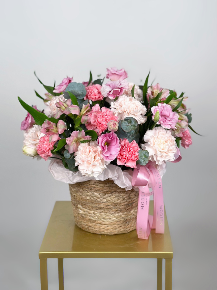 КОРЗИНА С ЭУСТОМОЙ, АЛЬСТРОМЕРИЕЙ И ГВОЗДИКОЙ