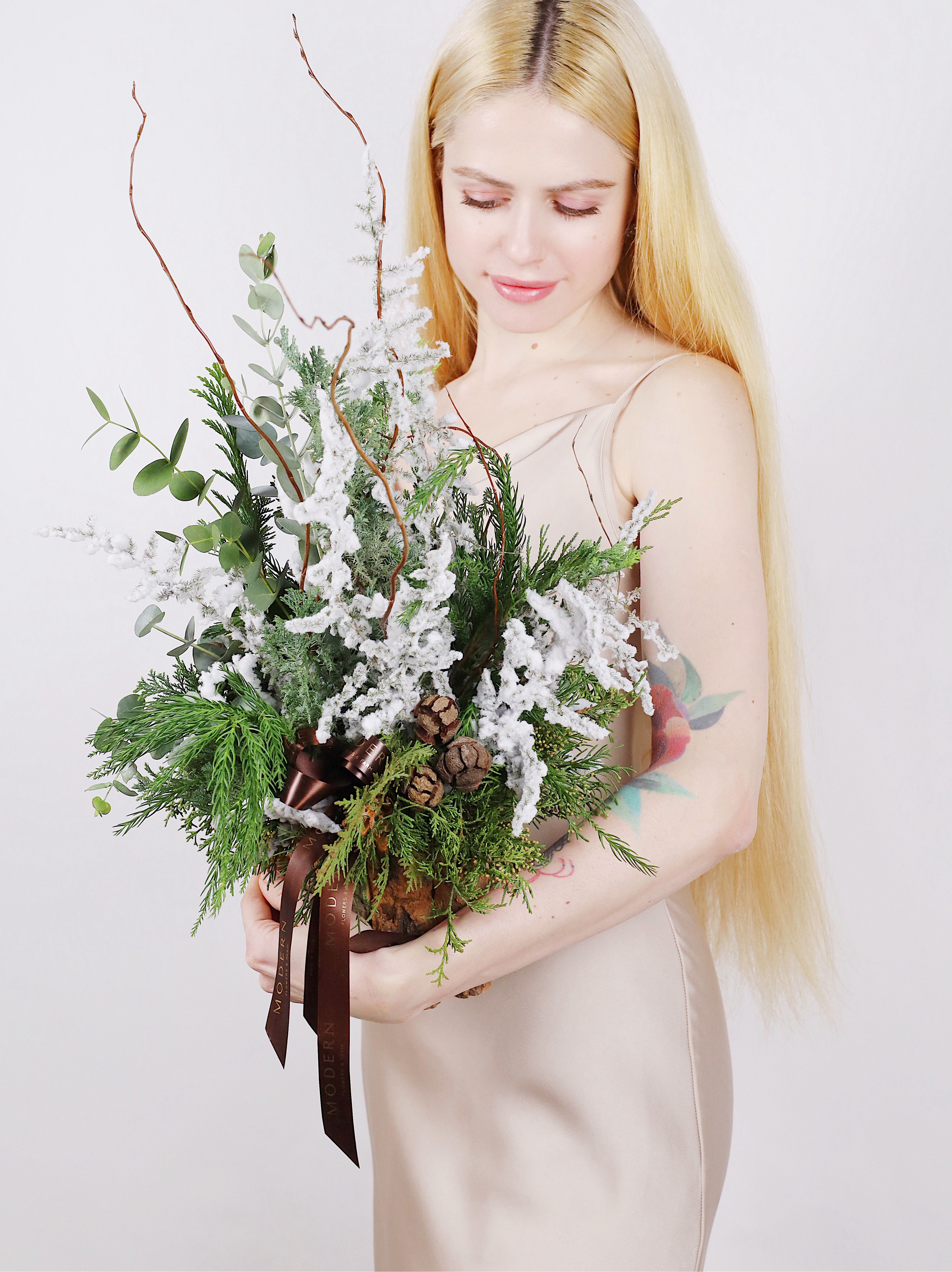 ХВОЙНАЯ КОМПОЗИЦИЯ В ДЕРЕВЯННОМ КАШПО