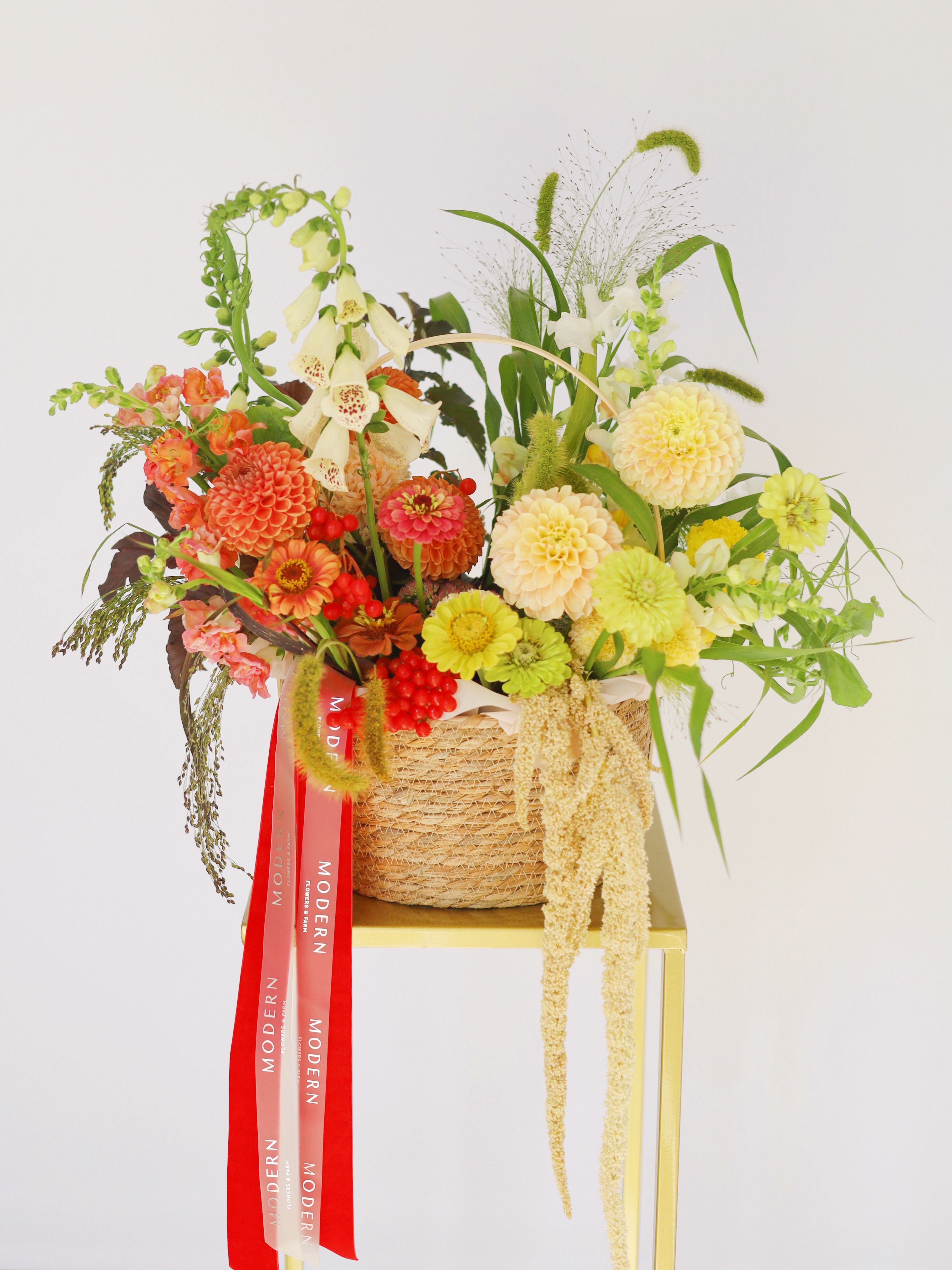 КОРЗИНА С ГЕОРГИНАМИ, НАПЕРСТЯНКОЙ И АМАРАНТОМ