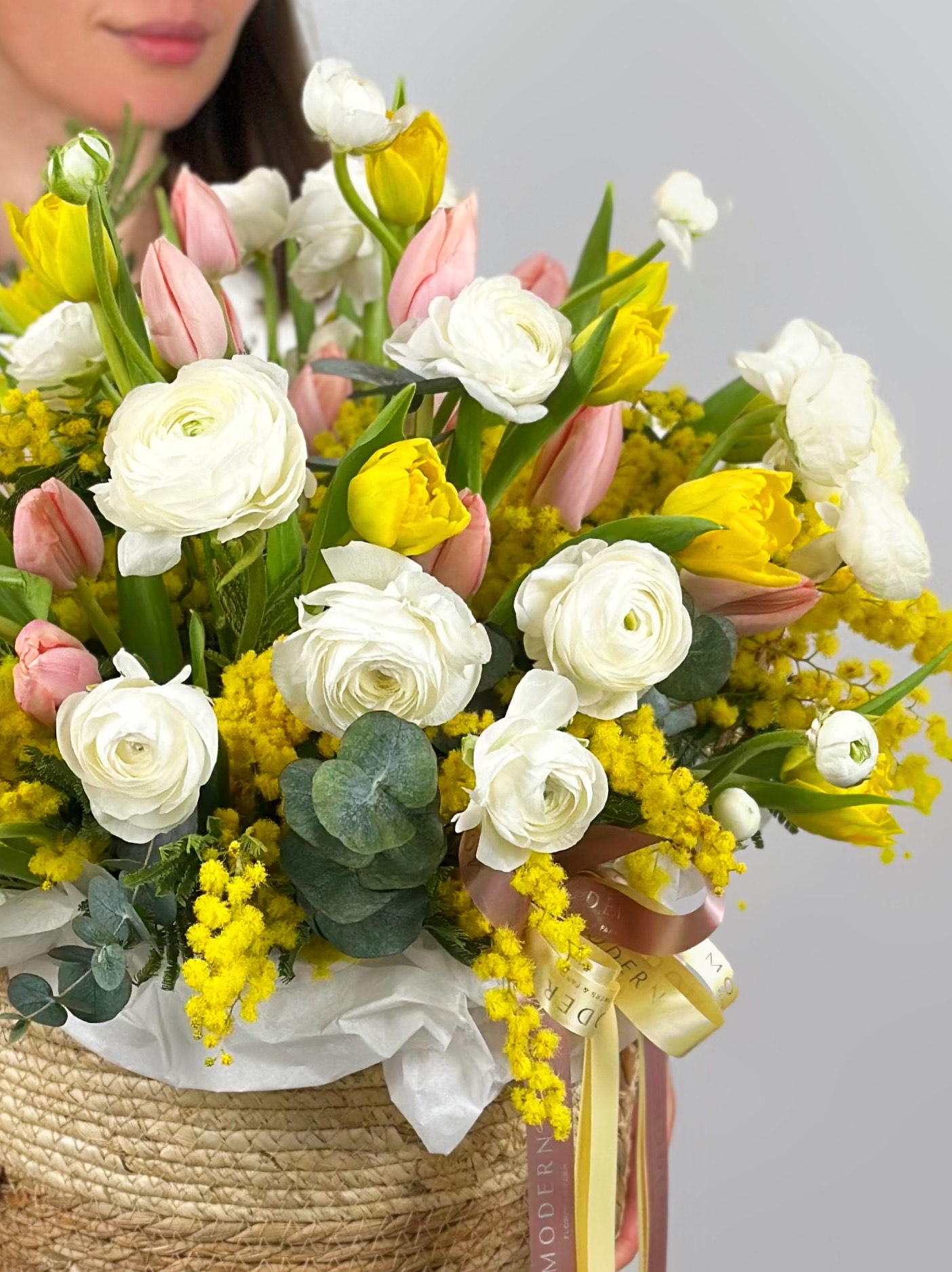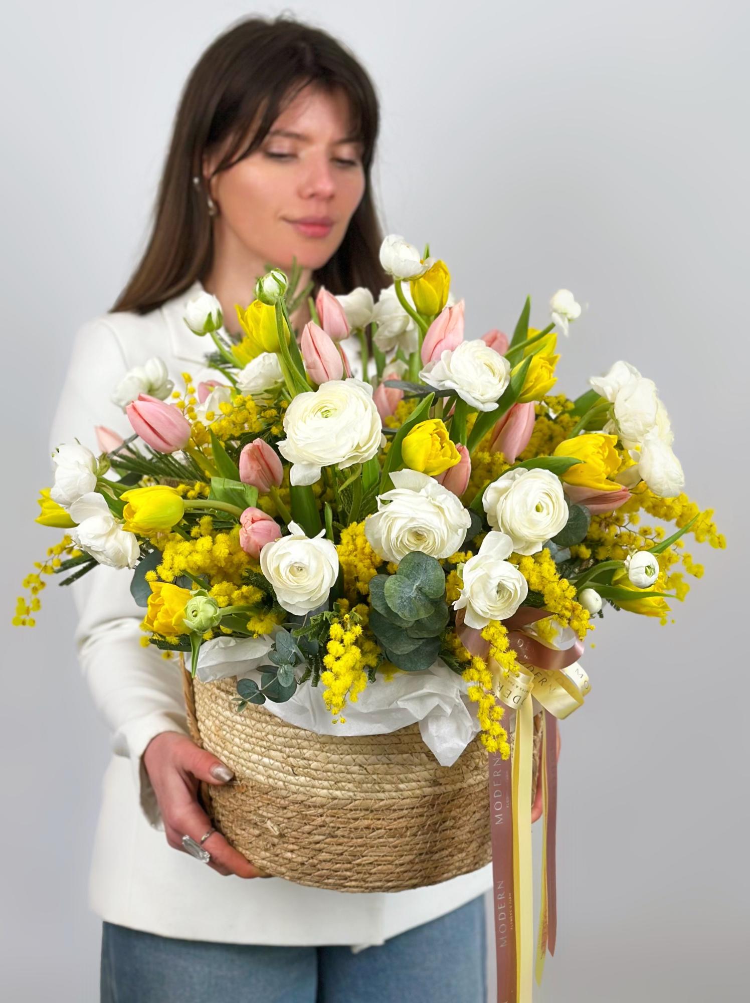 КОРЗИНА С МИМОЗОЙ, РАНУНКУЛЮСАМИ И ТЮЛЬПАНАМИ