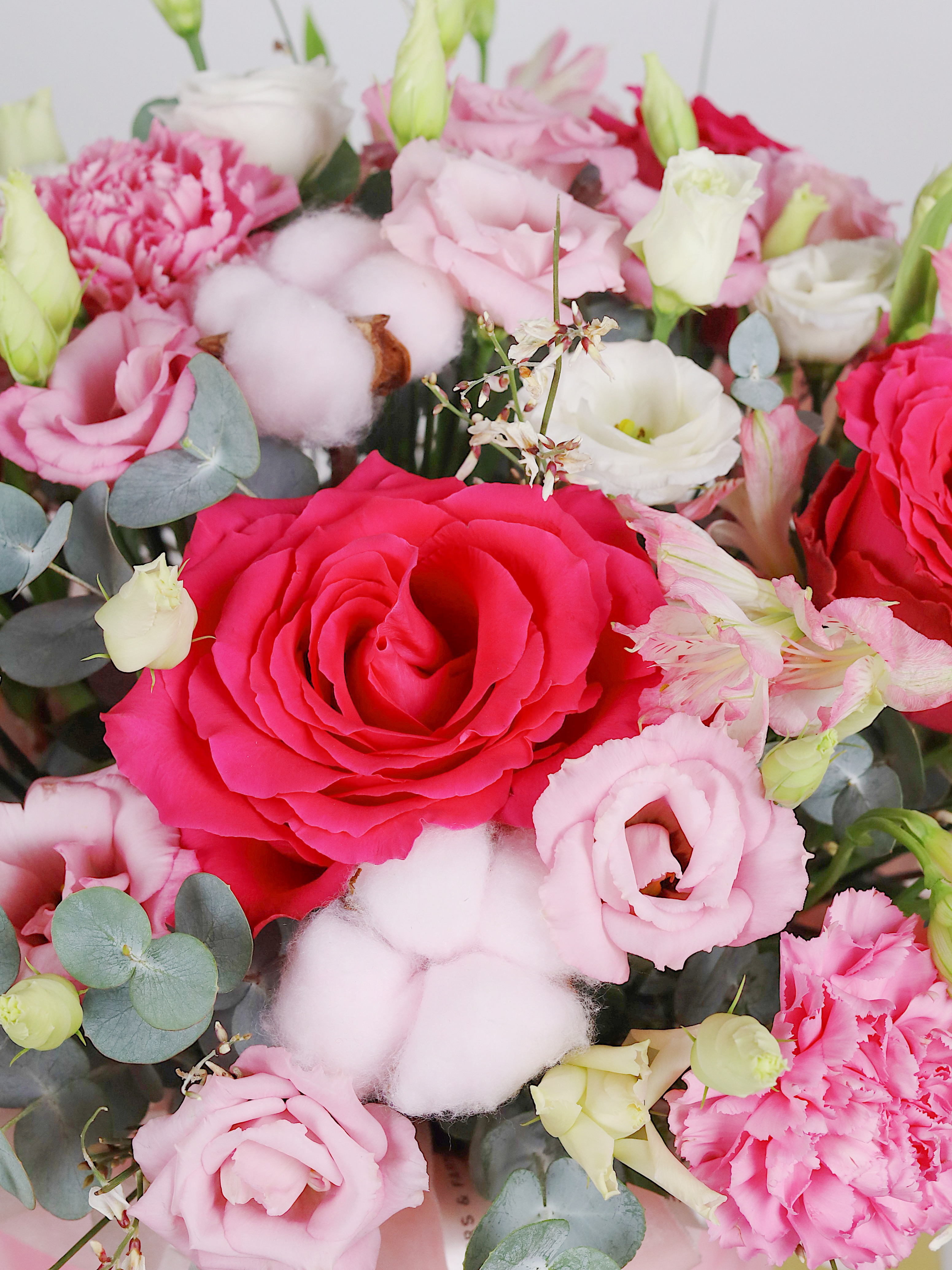 ПИОНОВИДНАЯ РОЗА, ЭУСТОМА, АЛЬСТРОМЕРИЯ В БАРХАТНОЙ ШЛЯПНОЙ КОРОБКЕ