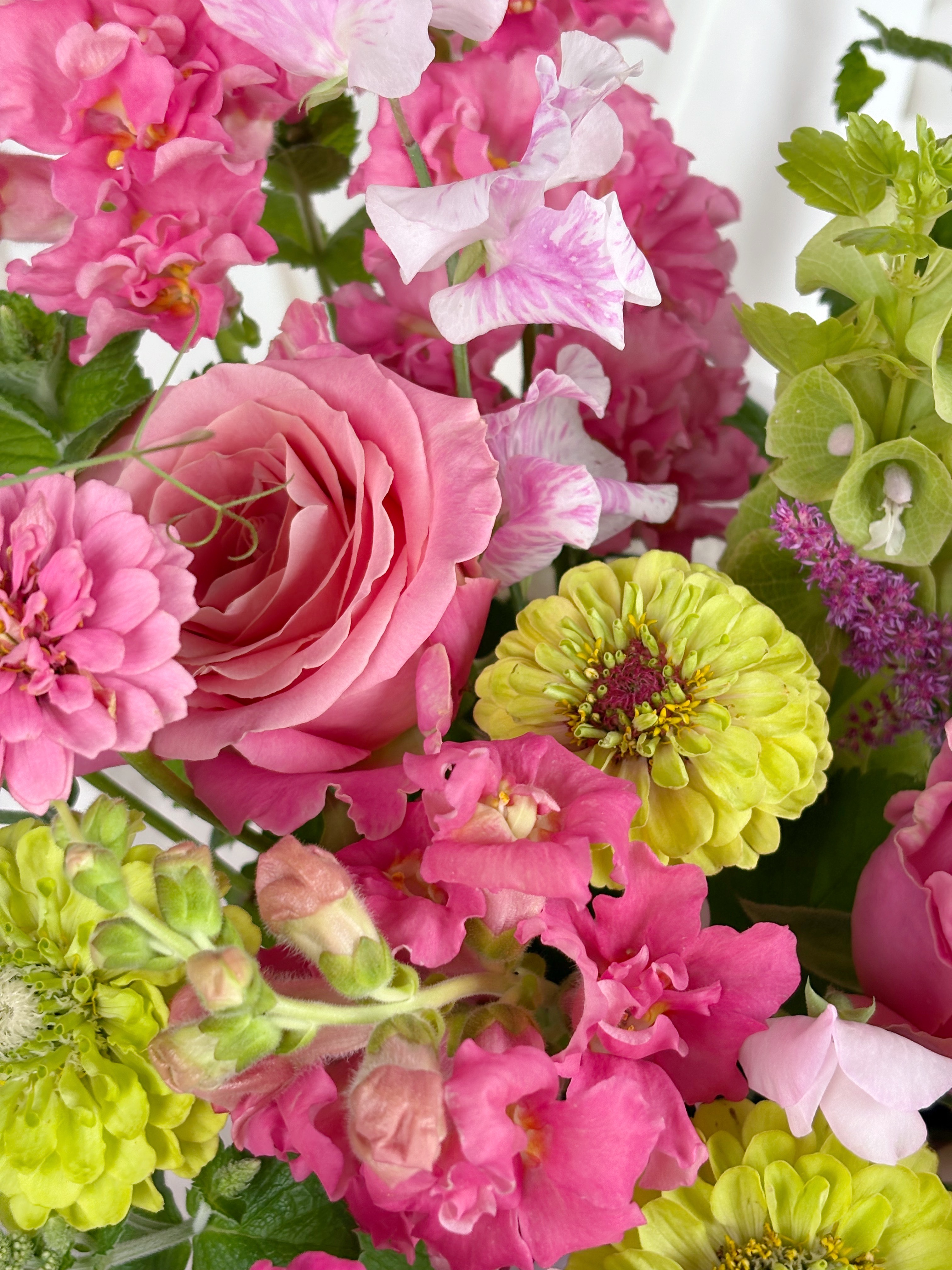 —СОЧНАЯ КОМПОЗИЦИЯ В ШЛЯПНОЙ КОРОБКЕ С РОЗОЙ И ДУШИСТЫМ ГОРОШКОМ