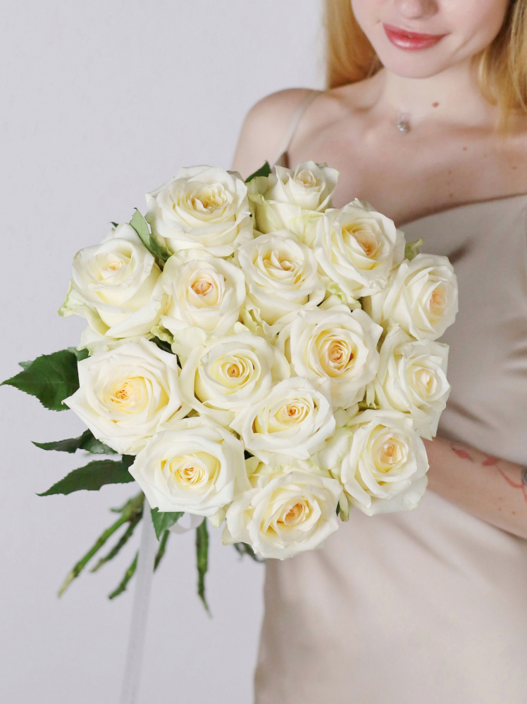 Букет из белых роз впечатляет получателя чистотой и нежностью оттенка. Композиция выглядит трогательно и элегантно, ее уместно подарить маме, жене, начальнице, подруге и т.д.